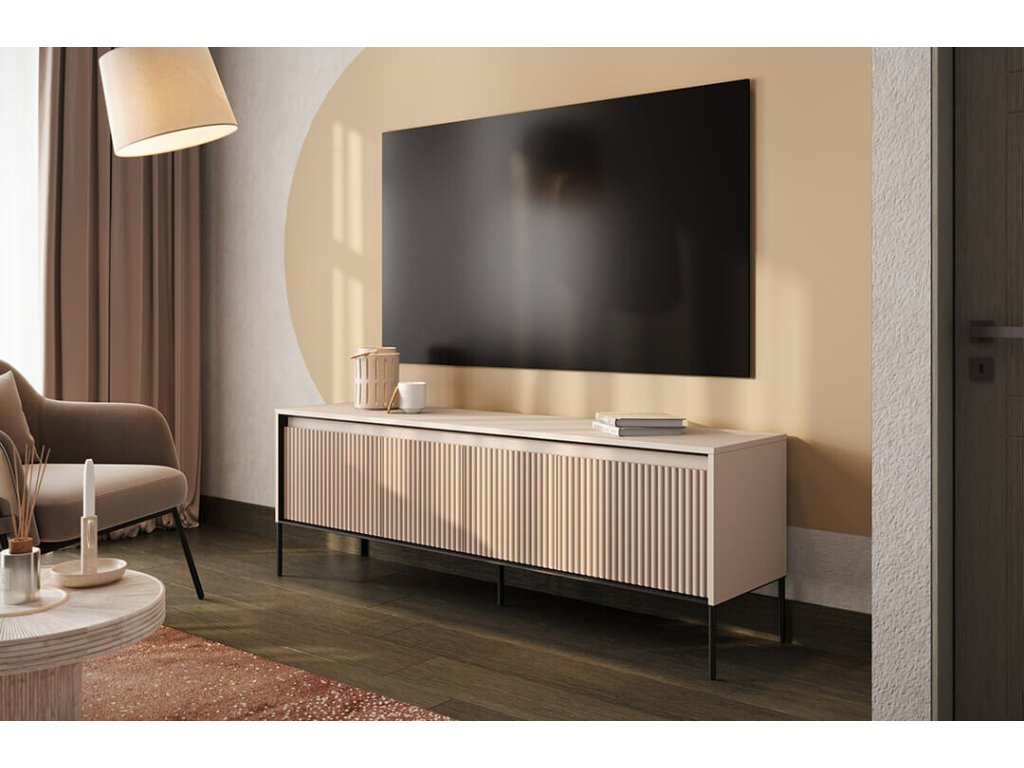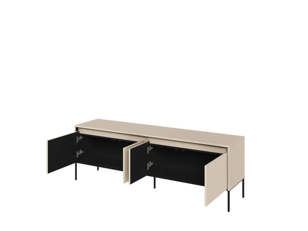 Moderní televizní stolek v sobě skrývá dostatek úložného prostoru v policích. Deska stolku je perfektním místem nejen pro televizi, ale i bytovou dekoraci, svíčky, květiny a osvětlení.