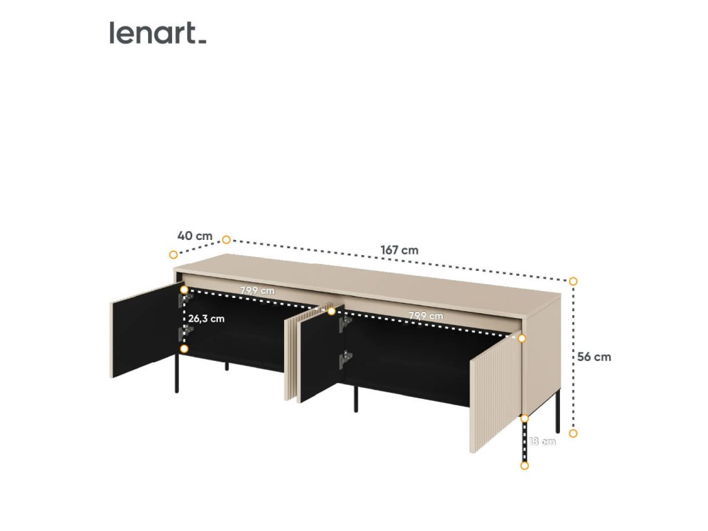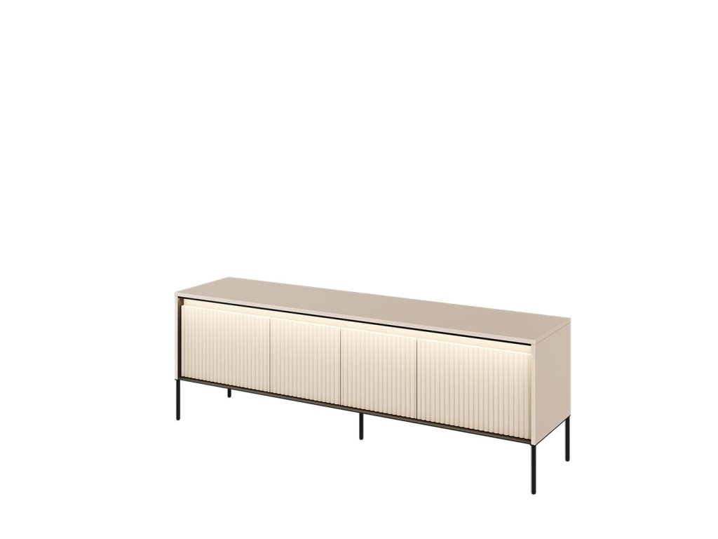 Zajímavým detailem tohoto kousku je žebrování na dvířkách, vyšší kovové nožičky a v neposlední řadě i LED osvětlení pod horní deskou, které vytvoří příjemnou atmosféru v prostoru.