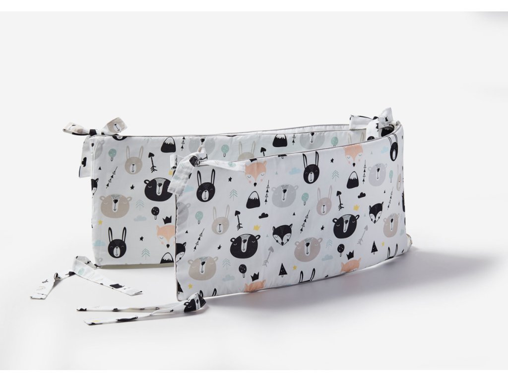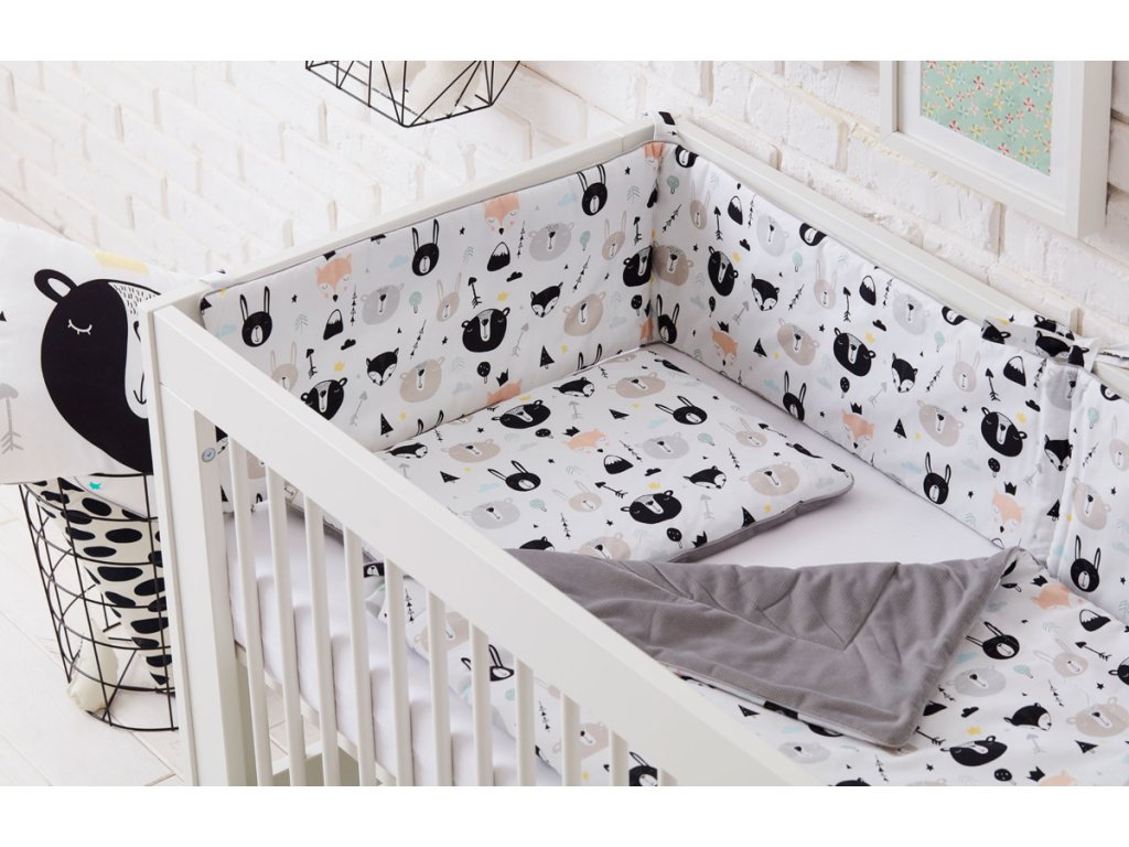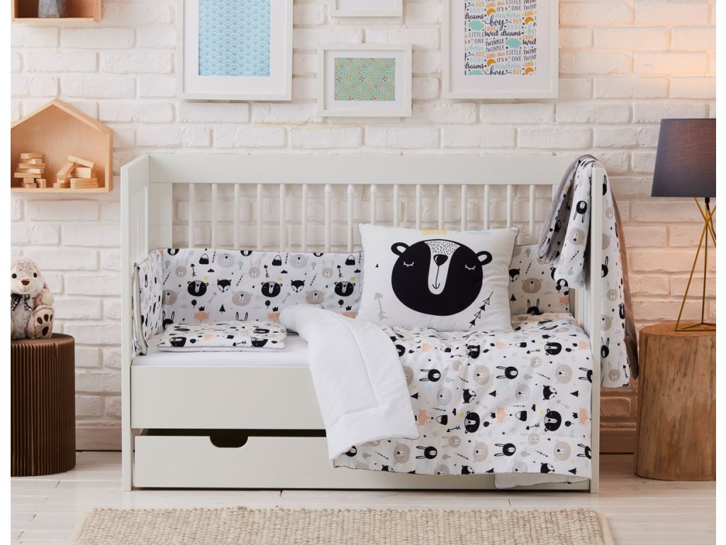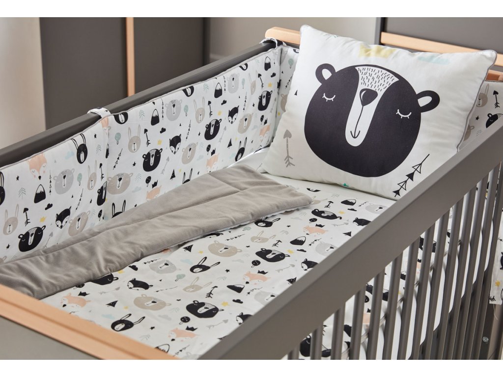 Mantinel Medvědi je součástí textilní kolekce stejného designu, jednotlivé kousky můžete kombinovat mezi sebou nebo rovnou pořídit celý komplet do postýlky. Patří sem polštářky a deky různých velikostí i přebalovací pult.