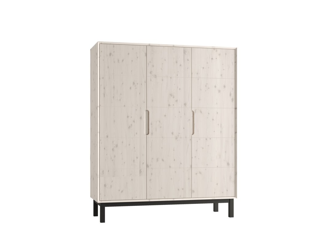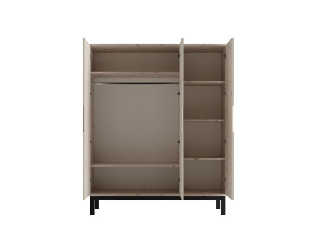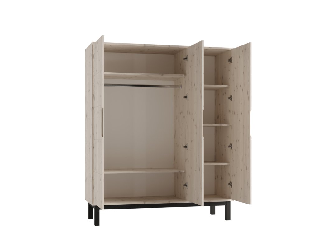 Třídveřová šatní skříň disponuje prakticky rozděleným prostorem. Za levými a prostředními dvířky je šatní tyč k zavěšení oděvů a prostorné police. Další čtyři police jsou umístěny za pravými dvířky, kam je možné umístit oblečení, hračky a další doplňky.
