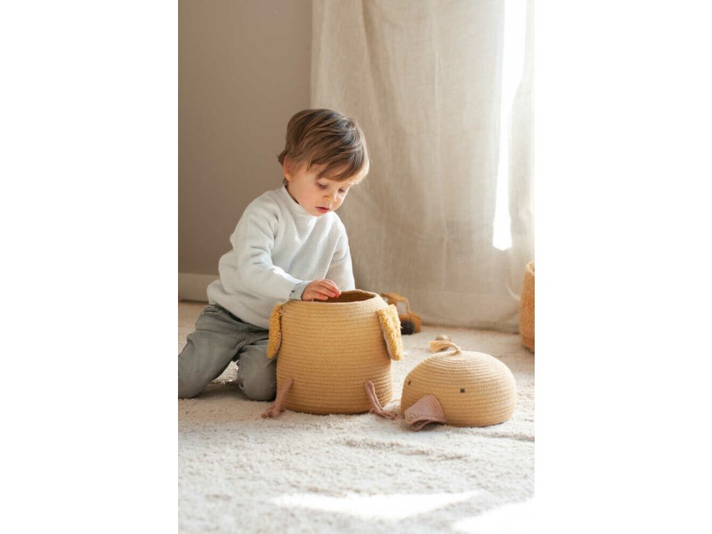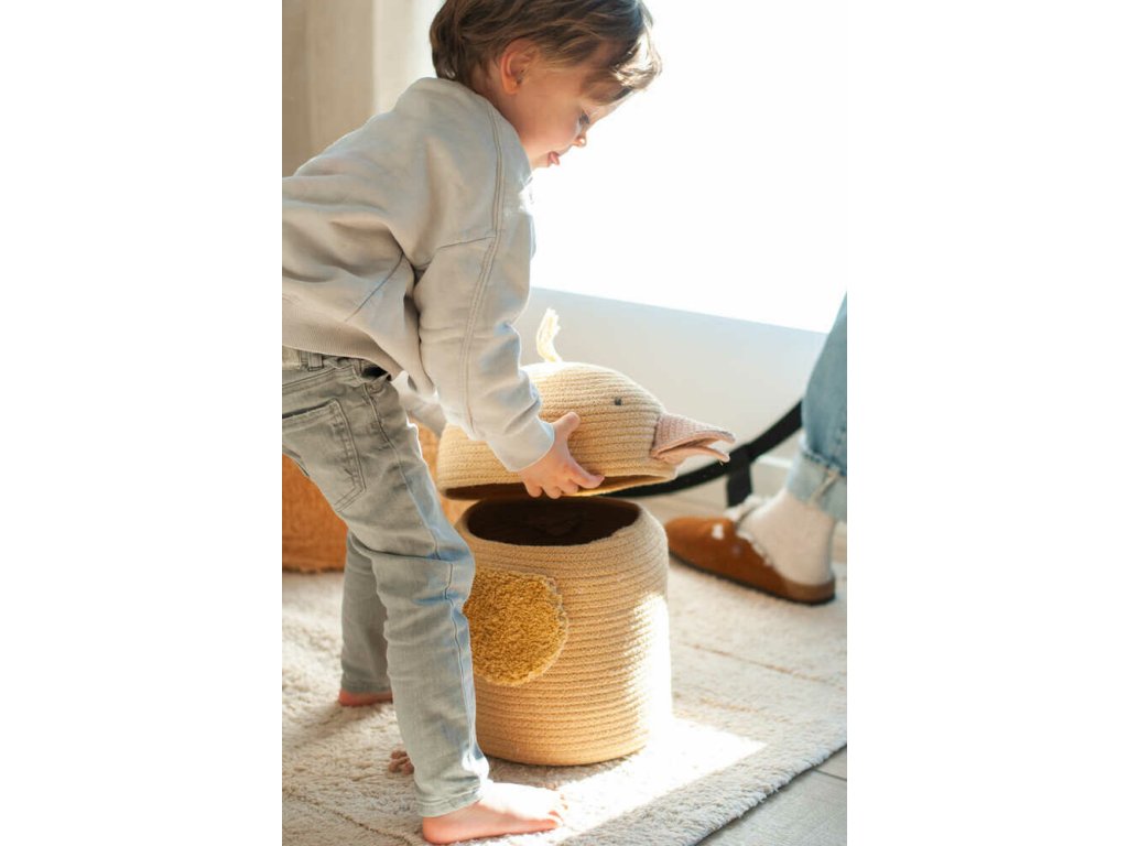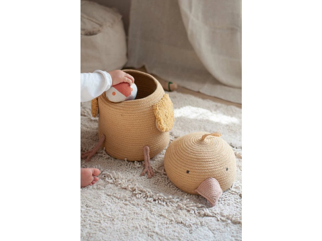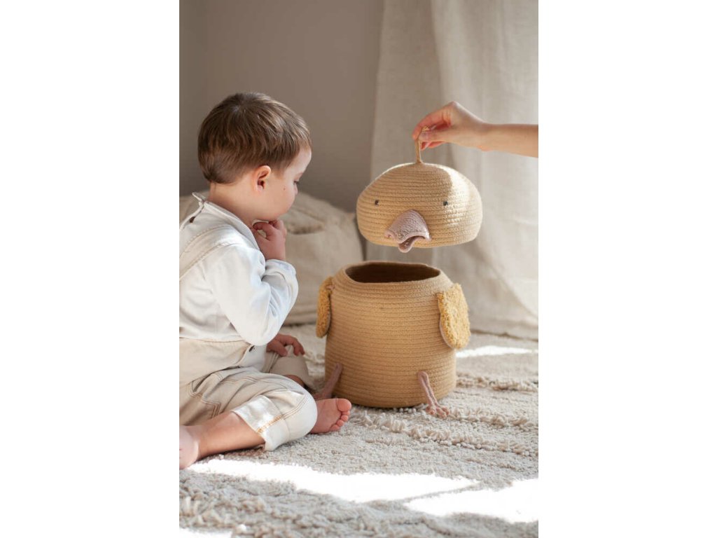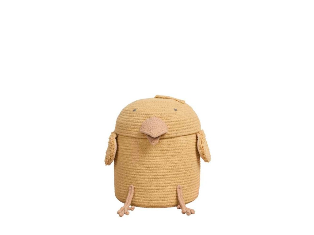 Žluté kuřátko s růžovým zobákem je nápaditý úložný koš pro děti. S košem si mohu děti hrát a schovávat v něm poklady a hračky. Veselý doplněk do dětských pokojů.