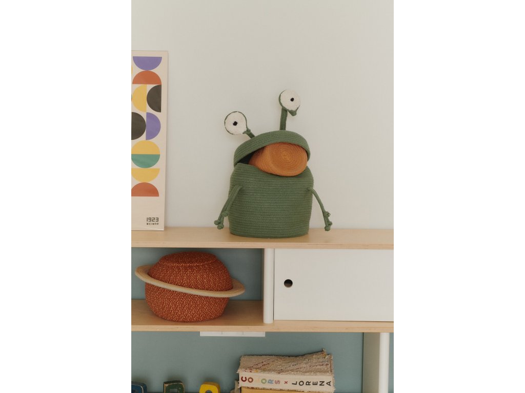 Zelený mimozemšťan jako úložný koš, se kterým si mohou děti hrát a schovávat v něm poklady a hračky. Veselý doplněk do dětských pokojů.