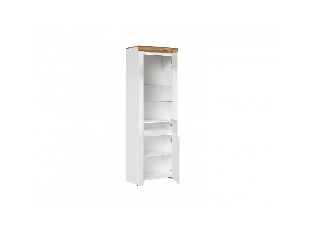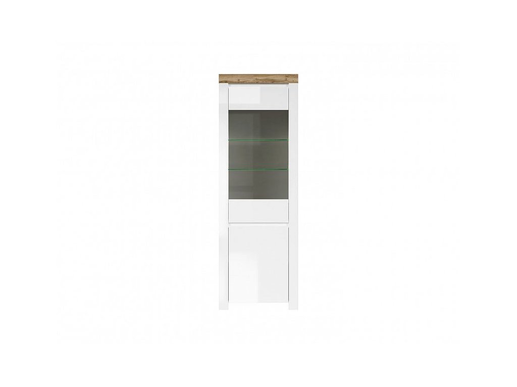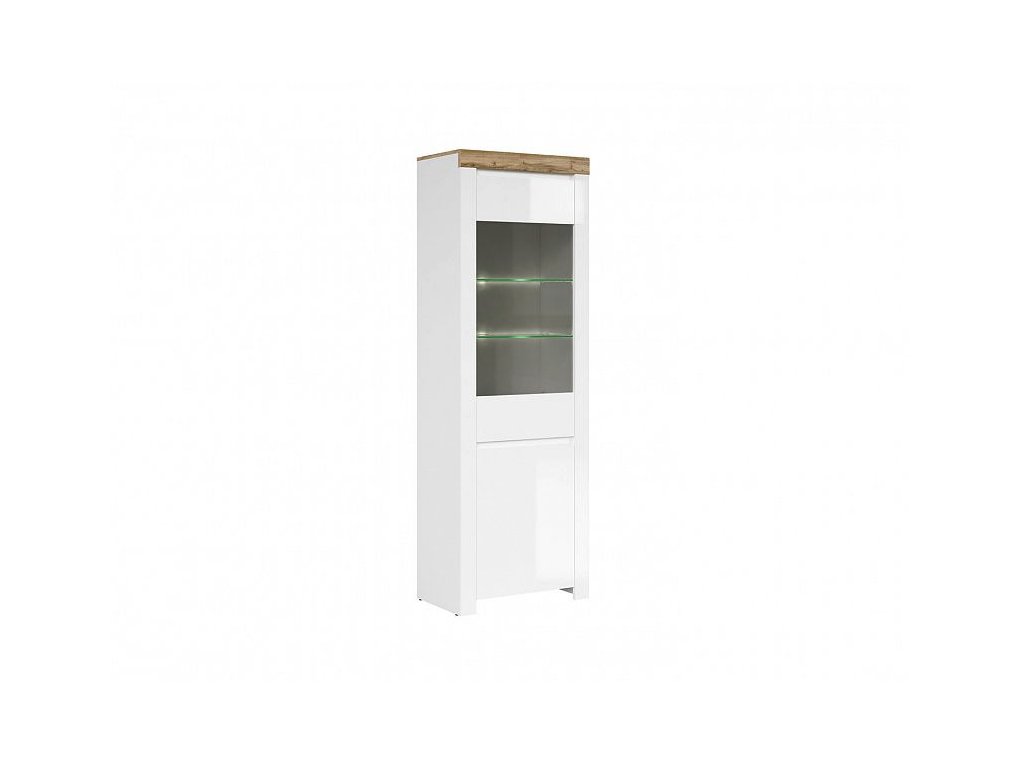 Vysoká vitrína je rozdělená na úložné prostory v zásuvkách a zavřených policích. Eleganci tomuto kousku dodává prosklená část pro umístění bytové dekorace k doladění interiéru. Do polic v prosklené části je možné dokoupit LED osvětlení a tím zvýraznit umístěné předměty.