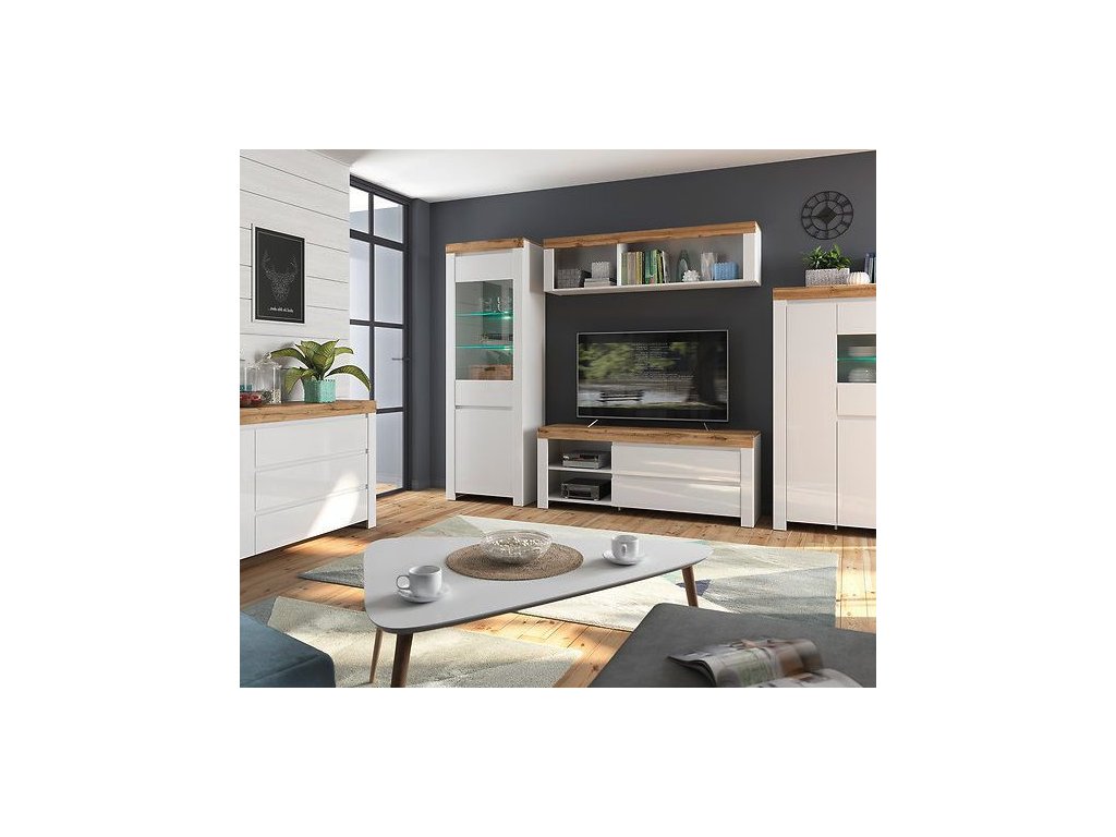 Nábytek je v kombinaci barev - bílá + dub woltan + bílý lesk, tedy světlý odstín s oblíbeným dřevěným prvkem, jež tvoří originální vrchní desku na každém kousku. Lesklá dvířka doplňují matné části a přidávají nábytku na luxusním vzhledu.