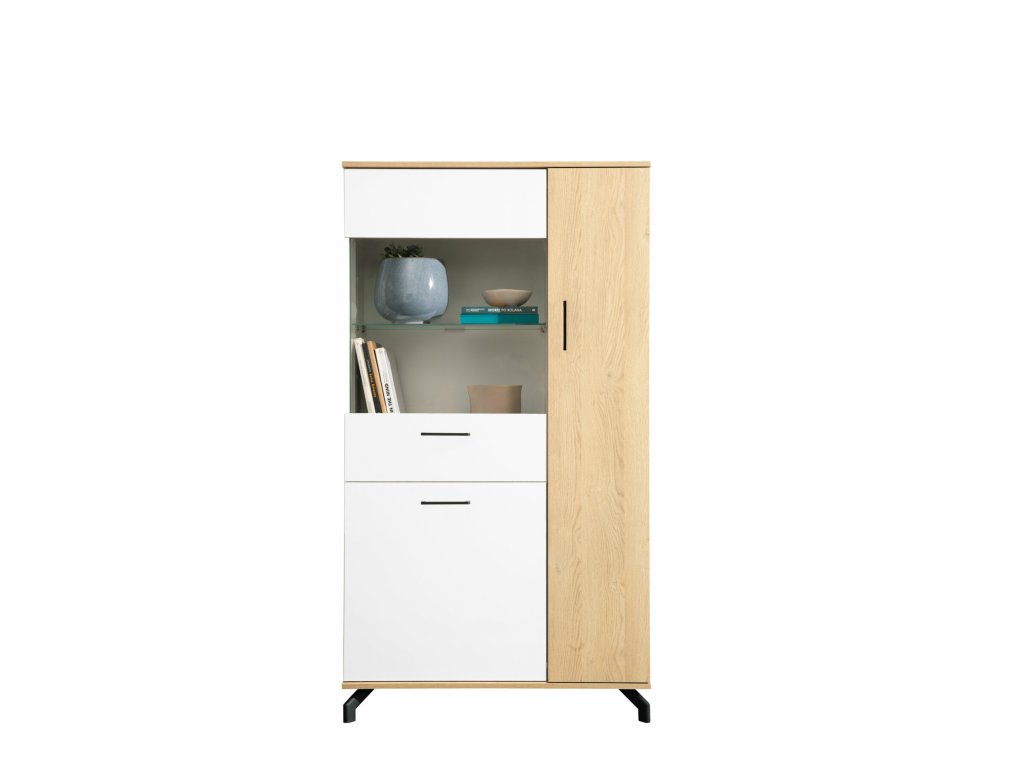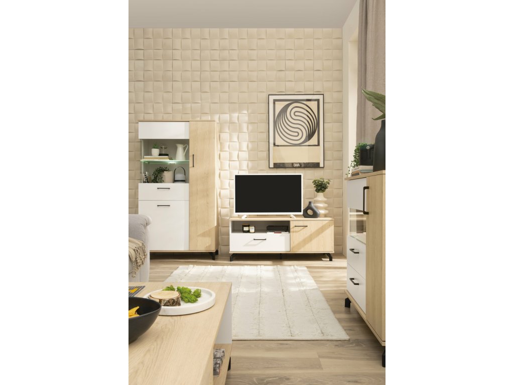 Vitrína Madison elegantně plní hned několik funkcí. Svým uživatelům nabídne úložný prostor v podobě zásuvek a polic za zavřenými dvířky a místo v prosklených policích pro bytovou dekoraci k doladění interiéru.