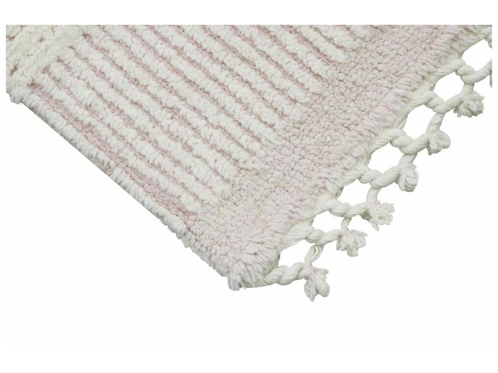 Vlněný koberec z exkluzivní kolekce PINK NOSE SHEEP je zcela jedinečný v použitých barvách, materiálech a celkovém procesu výroby. Koberec v barvě vlny se vzorem, jež je typický pro pletené svetry v zimním období. Motiv na světle růžovém podkladu vzbuzuje útulný dojem. Koberec je zakončený třásněmi, jež jsou spletené do copánků. Celá kolekce je z přírodní vlny a ručně tkaná. Koberec je snadné udržet v čistotě, lze prát na 30°C a tak vydrží dlouhá léta.