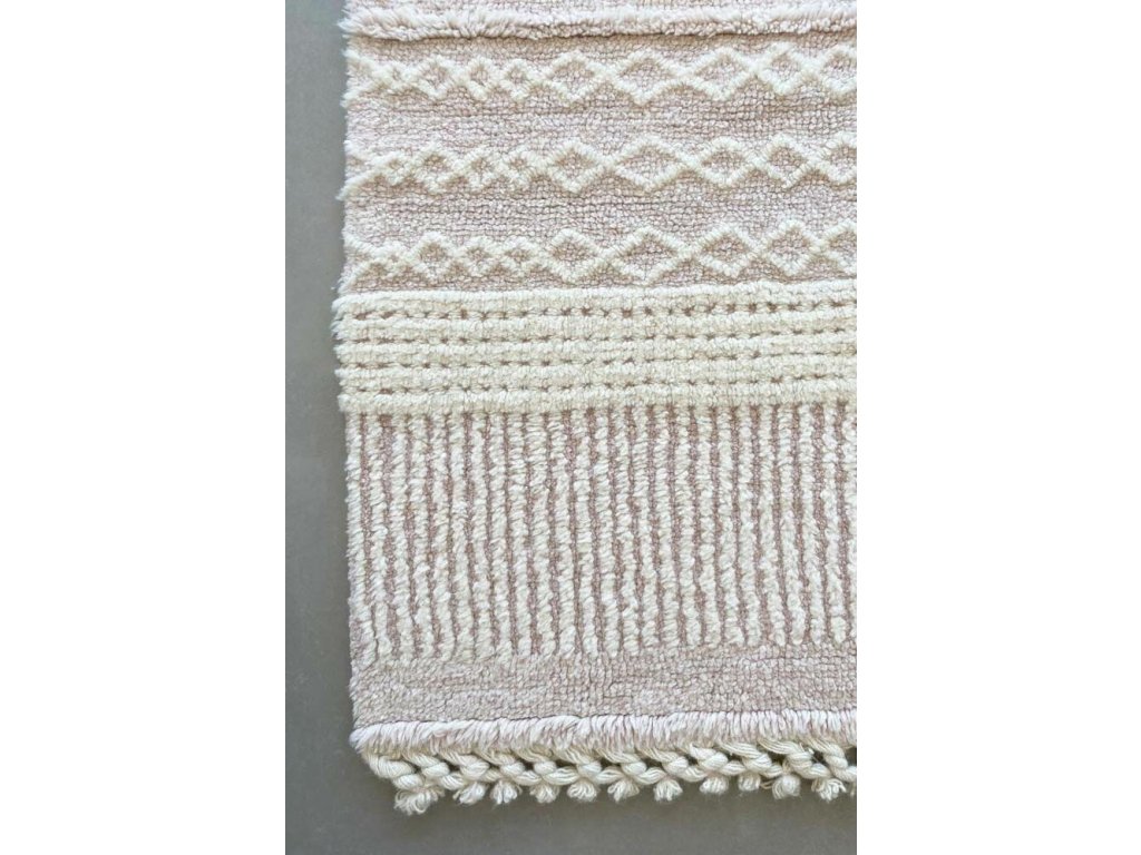 Vlněný koberec z exkluzivní kolekce PINK NOSE SHEEP je zcela jedinečný v použitých barvách, materiálech a celkovém procesu výroby. Koberec v barvě vlny se vzorem, jež je typický pro pletené svetry v zimním období. Motiv na světle růžovém podkladu vzbuzuje útulný dojem. Koberec je zakončený třásněmi, jež jsou spletené do copánků. Celá kolekce je z přírodní vlny a ručně tkaná. Koberec je snadné udržet v čistotě, lze prát na 30°C a tak vydrží dlouhá léta.