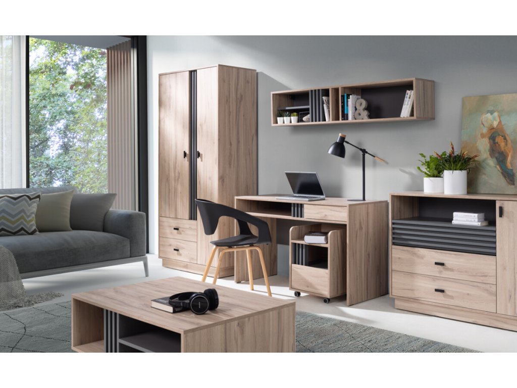 Moderní sektorový nábytek Allmo se nese na vlně oblíbeného spojení dekoru dřeva s antracitovou barvou. Tuto kolekci zdobí antracitové žebrování, jež přidává kouskům na originálním vzhledu. Zásuvky a dvířka jsou opatřeny tmavými úchyty, které nenarušují vzhled, naopak jej perfektně doplňují.