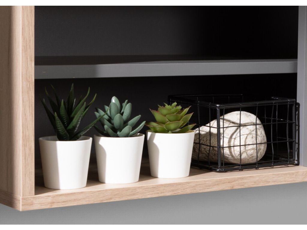 Závěsná police je z bočních stran uzavřená deskami, o které se mohou opírat knihy a tím se zabrání jejich posunutí či pádu. Vnitřní uspořádání úložného prostoru napomáhá k umístění různých předmětů, ať už se jedná o knihy, drobnou dekoraci, pokojové rostliny či osvětlení. Originální vzhled zajišťuje antracitové žebrování a police ve stejném odstínu. Skvělý způsob, jak využít místo na zdi a zároveň zútulnit obývací pokoj, studentský pokoj či domácí pracovnu.